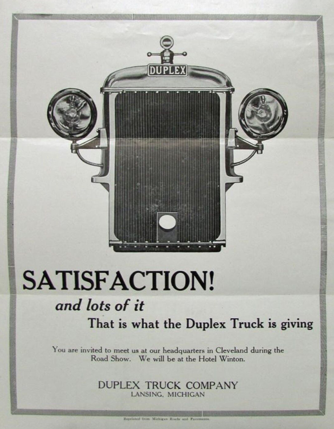 The 3-1/2-ton four-wheel-drive Duplex that appeared in 1916 did carry a radiator emblem in the form of the "Duplex" name cast into or embossed on the top front of the radiator and "Duplex 4 Wheel Drive" was also displayed on the sides of the truck under the driver's seat, probably using a stencil, see Duplex advertisement shown below: